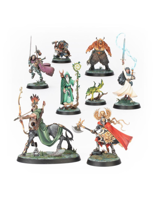 Contiene 49 miniaturas de encaje a presión, entre ellas 7 héroes, 37 enemigos y 4 fichas