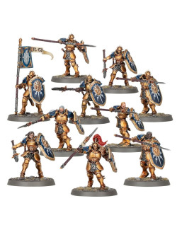 Al gritar letanías de fe, son capaces de conjurar arcos de rayo que saltan entre sus escudos y sus lanzas, lanzando voleas contra los enemigos con el poder fulgurante de Azyr. Una vez han plantado su bandera en el lugar que han decidido defender, estos adustos guerreros son casi imposibles de mover.