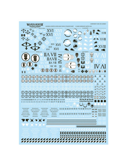 Este kit trae 1 hoja de calcomanías para vehículos superpesados de las Legiones Astartes con 718 calcomanías de gran calidad para que personalices tus miniaturas. Incluye iconografía de los Sons of Horus, Imperial Fists, Iron Warriors y Salamanders, además de marcas, números, coronas de laural y bandas de señalización genéricas para vehículos y escuadras.