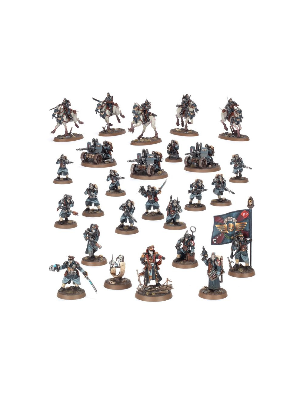 Si quieres sacrificarte en nombre del Dios Emperador esta caja es la forma perfecta de empezar o ampliar una colección de Korps de la Muerte de Krieg de forma más económica que comprando los kits por separado. Una Escuadra de Mando lidera la carga, seguida de una fiable Escuadra de Infantería. Las armas pesadas ofrecen fuego de cobertura mientras los Jinetes de la Muerte flanquean al enemigo, listos para golpear con sus feroces sables. Estas 26 miniaturas de plástico forman una fuerza completa del Astra Militarum para usar en disputadas partidas tácticas del formato Patrulla de Warhammer 40,000.