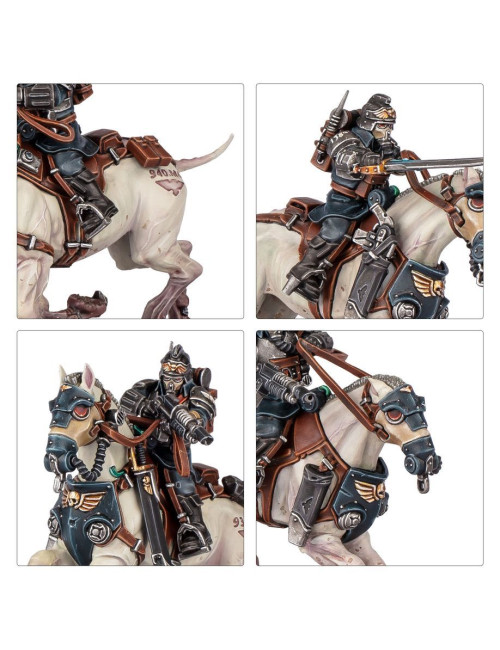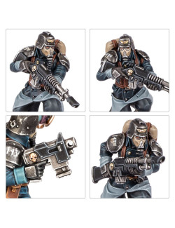 El Lord Comisario de la Escuadra de Mando puede equiparse con una pistola de plasma o un látigo en su brazo derecho, y con un puño de energía o una espada de energía envainada y señalando con su otro brazo. También puedes montar a uno de los Guardias Veteranos de tu unidad con una pistola láser, una pistola bólter o una pistola de plasma en la mano derecha, y con una espada sierra, arma de energía o garrote de trinchera en la izquierda. Otro guardia puede equiparse con un bólter, un rifle de plasma, un rifle de fusión o un lanzagranadas. Los otros Guardias llevan el estandarte del regimiento, el vocomaestro y los contraagentes alquímicos, respectivamente. También hay una gama de accesorios estéticos, como palas, para decorar aún más tus miniaturas.