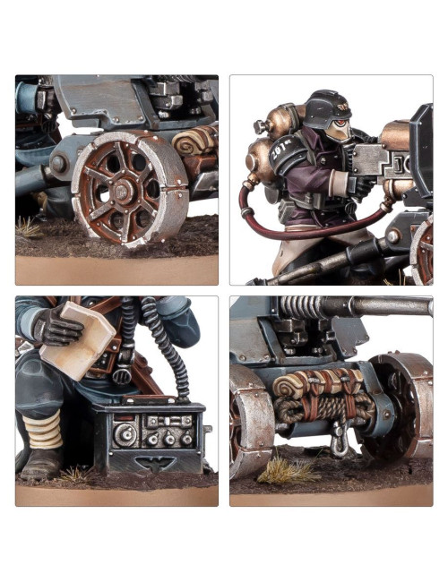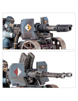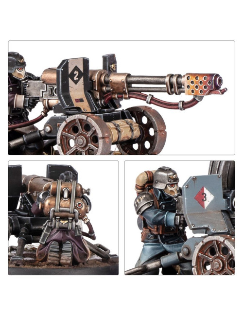 Los artilleros de la Escuadra de Armas Pesadas pueden equiparse con un cañón láser, un lanzallamas pesado de Krieg o una ametralladora pesada doble de Krieg, además de mochilas y accesorios intercambiables. El Coordinador de Fuego se puede montar reclinado sobre una rodilla o consultando un mapa del campo de batalla.