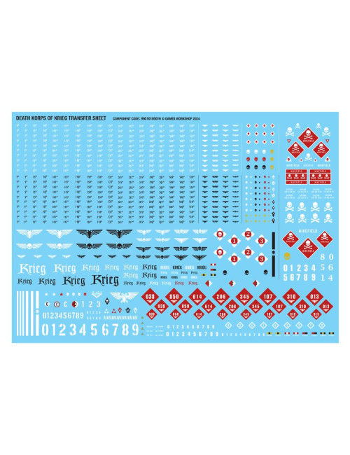 El kit contiene 803 piezas de plástico, 1 peana redonda Citadel de 32 mm, 17 peanas redondas Citadel de 25 mm, 5 peanas ovaladas Citadel de 60 mm x 35,5 mm, 3 peanas redondas Citadel de 50 mm y una hoja con 803 calcomanías al agua de gran calidad para que decores tus Korps de la Muerte de Krieg.