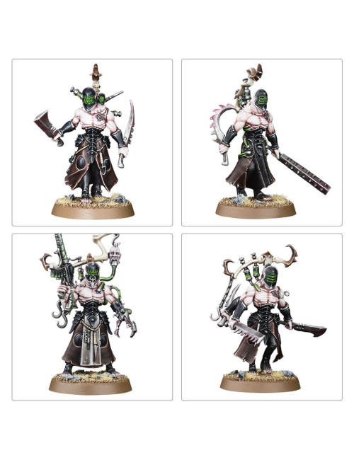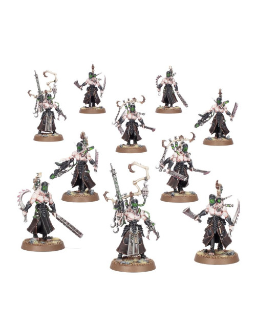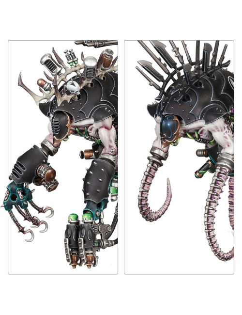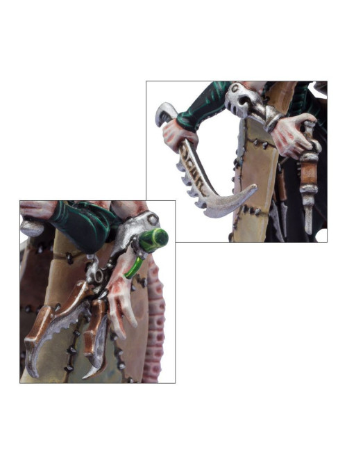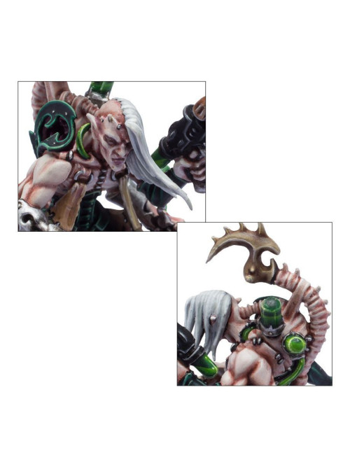 Los Cónclaves Hemónculos de los Drukhari son conocidos por ser unos artesanos de la carne sádicos y retorcidos. Sus filas están repletas de Atormentados mutados, apoyados por los imponentes artefactos de dolor Talos y Cronos, criaturas retorcidas que se deleitan incursionando en el espacio real. Los maestros Hemónculos están deseosos de probar sus creaciones en el crisol de la batalla, y la guerra le da a sus afligidas fuerzas una oportunidad de infligir dolor y sufrimiento en sus desdichadas víctimas.