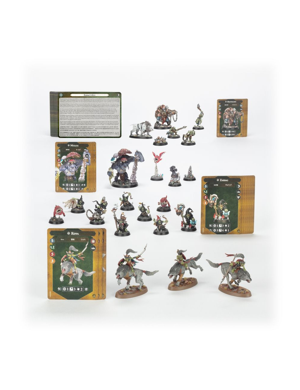 Este kit incluye cuatro bandas con temática de la Destrucción para Warhammer Underworlds. Todas las miniaturas son de encaje a presión, moldeadas en plástico coloreado e incluyen peanas escénicas en las matrices para que puedas empezar a jugar rápidamente. También encontrarás tarjetas de unidad y de guerrero para cada banda. Los Tramperos de Hrothgorn son una versátil banda de estilo flexible, los Colmibramantez de Rippa son una agresiva banda de asalto, los Vazilonez de Zarbag son una ambiciosa banda de control, y la Peña de Mollog usa el estilo de juego experimentado, que recompensa a los jugadores más estratégicos.