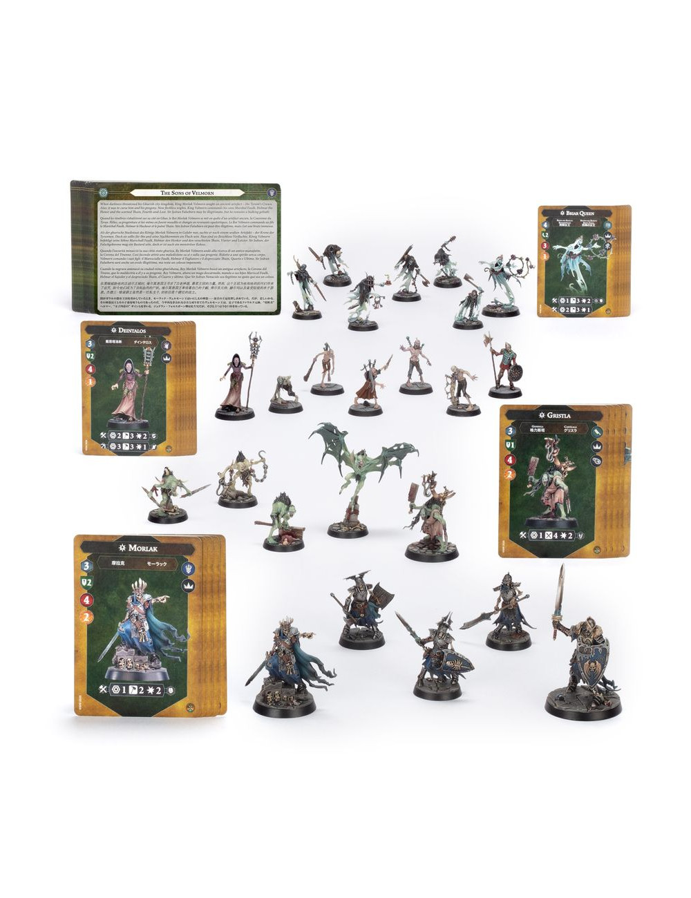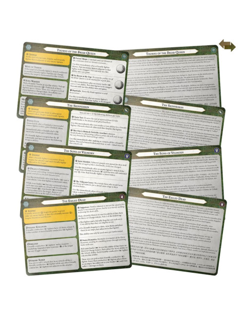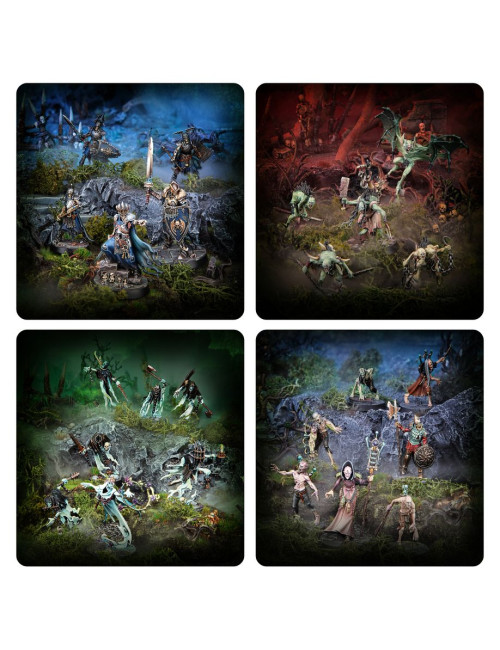 Este kit incluye cuatro bandas con temática de la Muerte para Warhammer Underworlds. Todas las miniaturas son de encaje a presión, moldeadas en plástico coloreado e incluyen peanas escénicas en las matrices para que puedas empezar a jugar rápidamente. También encontrarás tarjetas de unidad y de guerrero para cada banda. Los Hijos de Velmorn son una versátil banda flexible, los Desolladores son una agresiva banda de asalto, las Espinas de la Reina Zarza son una ruda banda de control y los Muertos Exiliados usan el estilo de juego experimentado, perfecto para los jugadores más estratégicos.