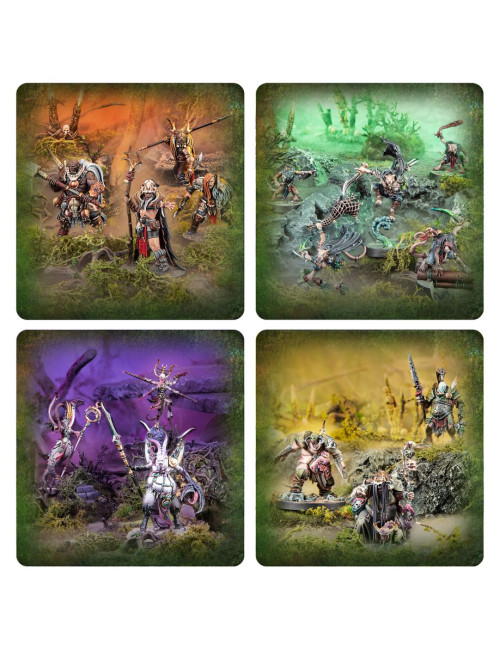 Este kit incluye cuatro bandas con temática del Caos para Warhammer Underworlds. Todas las miniaturas son de encaje a presión, moldeadas en plástico coloreado e incluyen peanas escénicas en las matrices para que puedas empezar a jugar rápidamente. También encontrarás tarjetas de unidad y de guerrero para cada banda. La Manada Frondaespíritu es una versátil banda flexible; los miembros de la Manada de Rozarrastrado conforman una agresiva banda de asalto, y la Triple Discordia y los Despojos de Gusano usan el estilo de juego experimentado, perfecto para los jugadores más estratégicos.