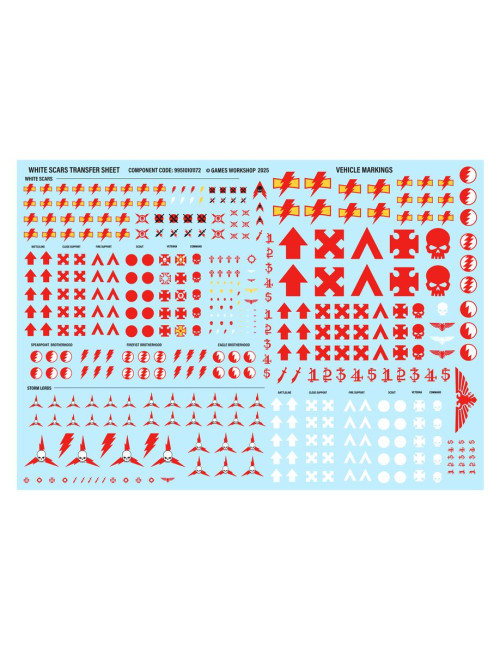 El kit viene con una nueva hoja de calcomanías para Cicatrices Blancas con 407 calcomanías al agua de gran calidad, con iconos del Capítulo, iconos de roles en batalla y números. También hay iconografía de las compañías de la Hermandad Punta de lanza, la Hermandad Puño de fuego y la Hermandad del Águila, así como del Capítulo sucesor de los Señores de las Tormentas.