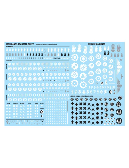 El kit viene con una nueva hoja de calcomanías para Manos de Hierro con 468 calcomanías de gran calidad, con iconos del Capítulo, iconos de roles en batalla y números. También incluye iconografía del Clan de Guerra de Atropos de los Hijos de Medusa, el Clan Avernii, el Clan Garrsak, el Clan Raukaan y el Clan Kaargul.