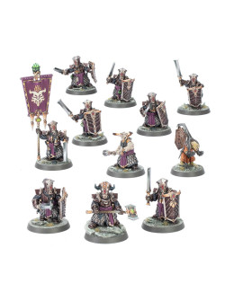 El kit también incluye piezas para montar un campeón opcional con una selección de dos cabezas y armado con un hacha de dos manos o con martillo y escudo. El portaestandarte opcional puede elegir entre tres cabezas y tres sombreretes para el estandarte. El músico opcional va acompañado de un Hobgrot que puede elegir entre dos cabezas. Los escudos y brazos izquierdos son intercambiables entre todas las miniaturas, haciendo que personalizar a tus disciplinados y despiadados guerreros sea de lo más sencillo.