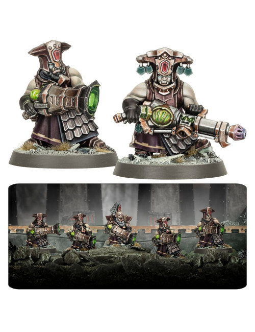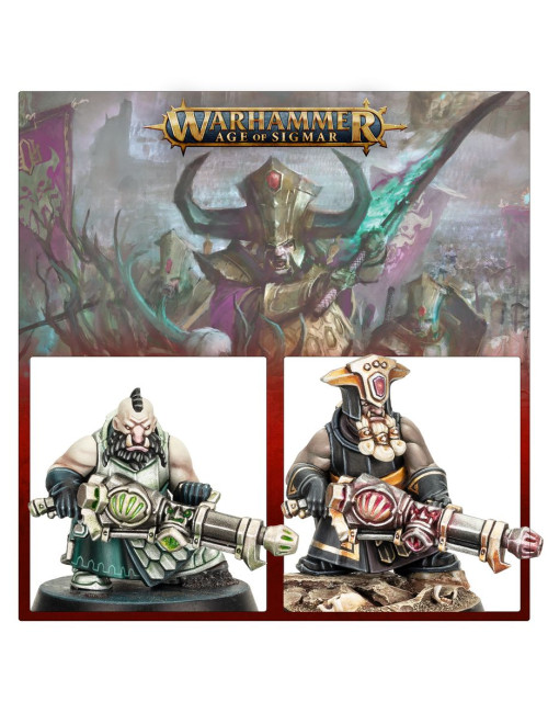 Con este kit multicomponente de plástico puedes montar cinco Arrasadores Infernales, infantería con una gran potencia de fuego para tus ejércitos de Herreros Infernales de Hashut de Warhammer Age of Sigmar. Fuertemente armados y equipados con devastadores trabucos Grizmalok o tirallamas Karagthrun para abrasar a la infantería enemiga, están preparados para proteger objetivos vitales y repartir muerte desde la distancia. El kit también contiene piezas para montar un campeón opcional para tu unidad de mortíferos guerreros.