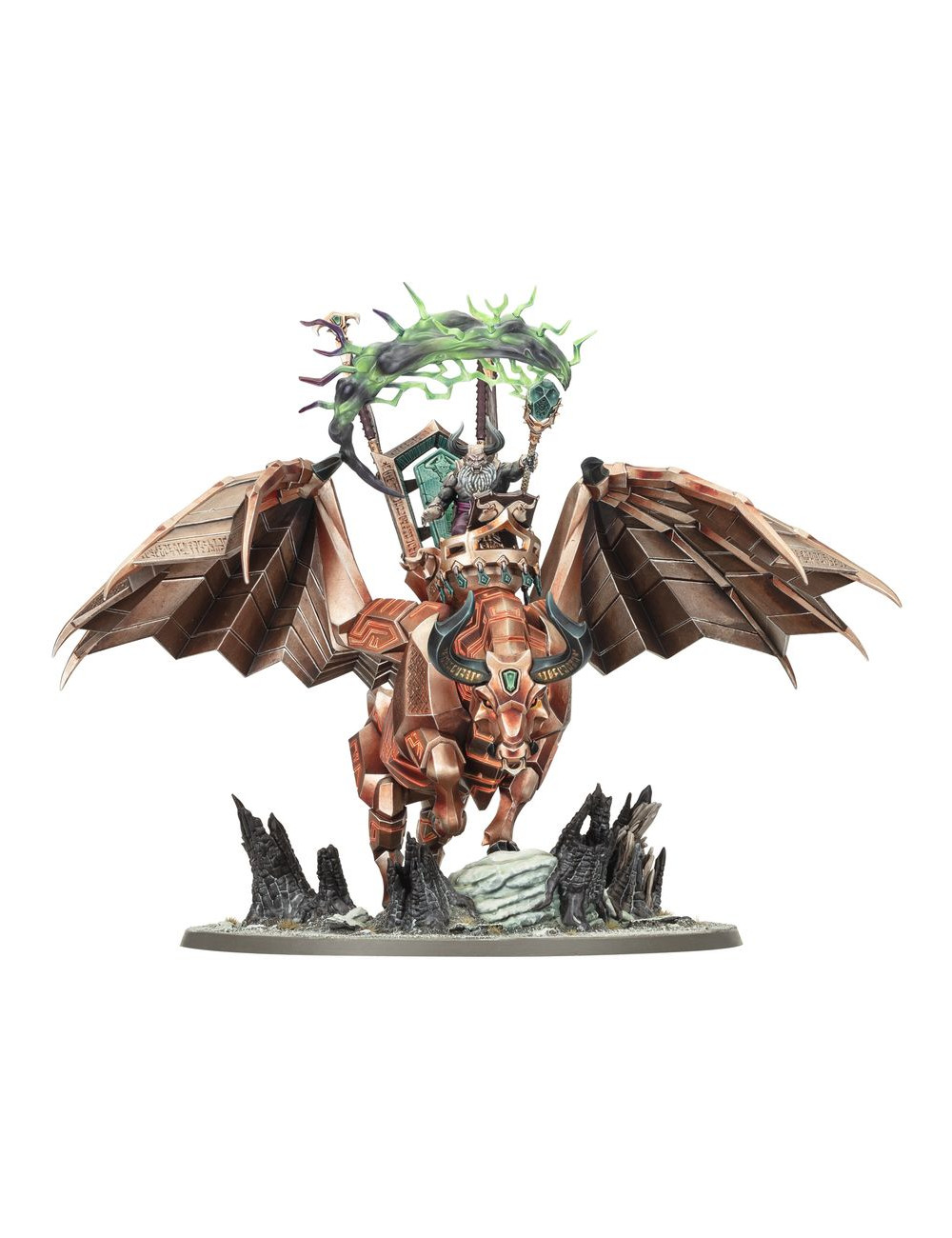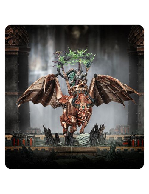 Con este kit multicomponente de plástico puedes montar a Urak Taar montado a lomos de su Tauro Infernal, Ghorrakos. Como primer y principal Herrero Daemónico, es el líder definitivo para tus ejércitos de Herreros Infernales de Hashut de Warhammer Age of Sigmar. Urak Taar es un auténtico terror sobre el campo de batalla, arrojando hechizos incluso mientras su montura aplasta a sus enemigos bajo sus pezuñas de metal y los despedaza con sus largos cuernos. Con 144 mm de altura y una envergadura de 193 mm, esta miniatura oscuramente majestuosa destacará por encima de todo tu ejército. Además de dominar el tablero de juego, sus increíbles detalles, como su piel de piedra maldita, runas y gemas, hacen que sea un auténtico desafío para pintores. Taar puede montarse con o sin temibles ráfagas en su báculo.