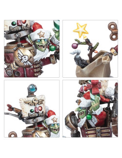 Con este kit multicomponente de plástico puedes montar el Chikolata del Gobbo Rojo, una construcción mecánica para tus ejércitos de Orkos de Warhammer 40,000. El Gobbo Rojo aparece echando un vistazo impertinente por la escotilla, listo para repartir un poco de explosiva alegría navideña y arrastrando un saco lleno de “regalitos”.
