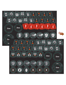 Dentro de la caja también encontrarás una hoja con 39 marcadores de doble cara de Vigías de la Muerte para que lleves fácilmente la cuenta de tus armas y de los efectos en el juego en plena batalla.