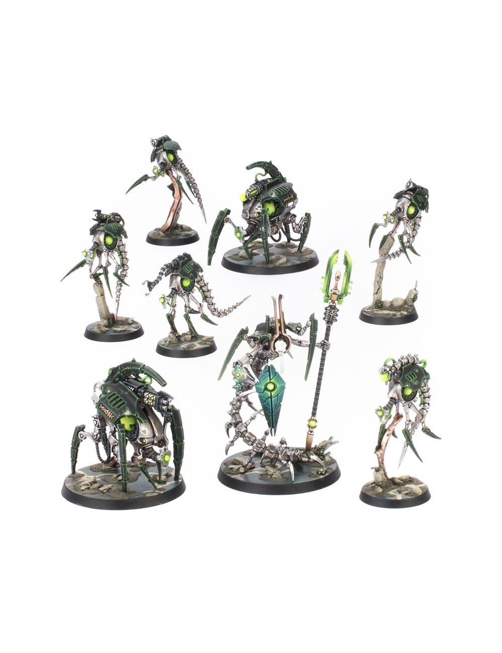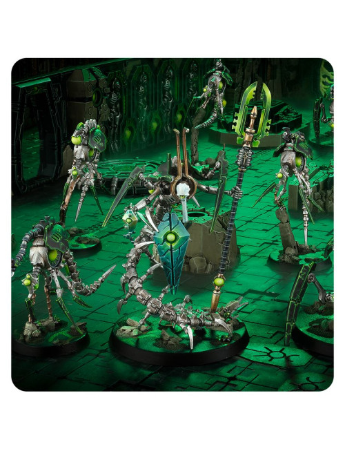 Con este kit multicomponente de plástico puedes montar ocho miniaturas de Círculo Canóptico. Estas miniaturas pueden usarse como implacables agentes de Círculo Canóptico en partidas de Kill Team o desplegarse en un ejército necrón de Warhammer 40,000. Con el kit puedes montar una Geomante, dos Trepatumbas y cinco Combatientes Macrocitos. El kit incluye diversas opciones de armas para personalizar tus Trepatumbas y tus Combatientes Macrocitos, además de piezas para montar especialistas como el poderoso Acelerador Macrocito y el Reanimador Macrocito experto en reparaciones.