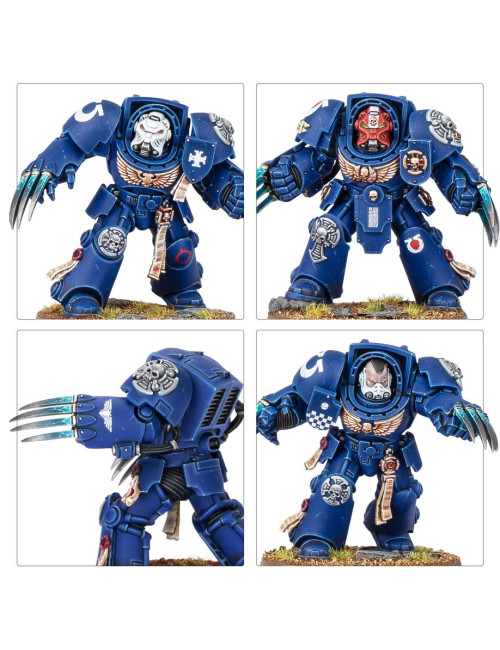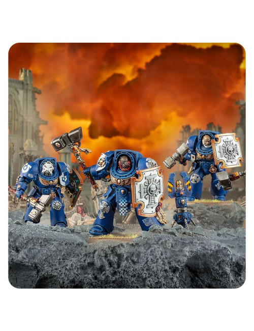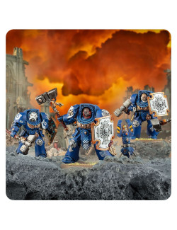 Las Escuadras de Exterminadores de Asalto están equipadas con devastadoras armas de combate perfectas para sus feroces asaltos y salvajes acciones de abordaje. Gustan de cargar contra los guerreros más formidables del enemigo, despedazándolos con sus garras relámpago o aplastándoles el cráneo con sus martillos de trueno.
