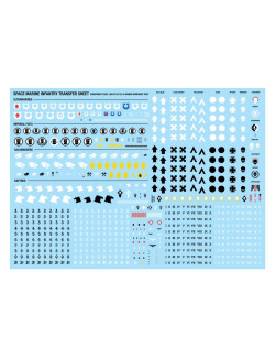El kit incluye una hoja con 758 calcomanías de gran calidad para infantería de los Marines Espaciales, con emblemas de Capítulo para Ultramarines, Puños Imperiales, Salamandras y Aves de Presa, además de indicadores de roles en batalla, números y más.