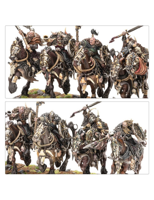 Los Marauder Horsemen pueden montarse como una sola unidad de 10 guerreros o dos unidades de 5, cada una con su campeón, portaestandarte y músico opcionales. Cada Marauder puede equiparse con spear y shield o con flail, y pueden elegir entre dos cabezas: una con casco y otra descubierta.