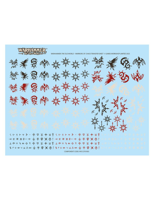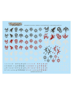 La caja trae dos hojas con 246 calcomanías de gran calidad para Warriors of Chaos cada una, con marcas para los cultos del Sabueso Ensangrentado, el Cuervo Carroñero, la Serpiente Escurridiza y el Rapaz Funesto, junto con otros símbolos y runas del Caos.