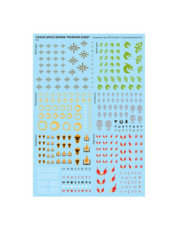 El kit trae dos hojas de calcomanías para Marines Espaciales del Caos, cada una con 364 calcomanías de gran calidad con símbolos para la Legión Negra, la Legión Alfa, los Mil Hijos, los Guerreros de Hierro, los Portadores de la Palabra y los Amos de la Noche, junto con otros sellos malditos para que decores tus miniaturas.