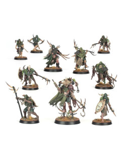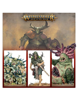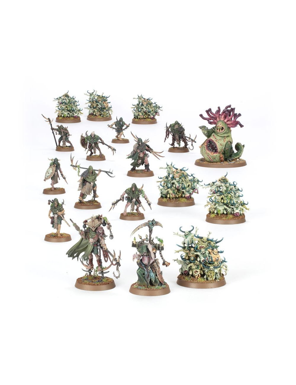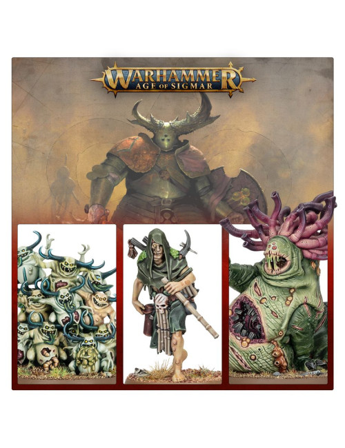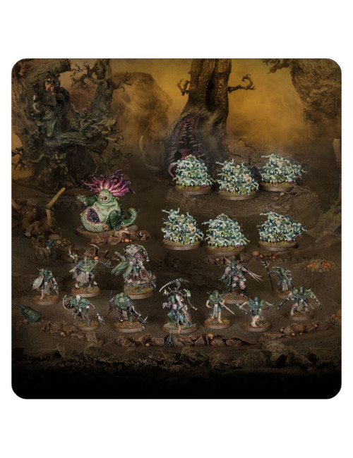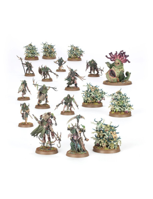 El Abuelo Nurgle llama a la guerra, y esta caja es una forma perfecta de empezar o ampliar una colección de Agusanados de Nurgle de forma más económica que comprando los kits por separado. El ejército está liderado por un Hechicero Putrefactor que canaliza la magia enfermiza de su dios. El grueso del ejército está compuesto por un culto del Credo Putrefango, secuaces mortales que ansían propagar las enfermedades de Nurgle, y un numeroso contingente de Nurgletes también se ha apuntado a la fiesta. Estas traviesas hordas son difíciles de matar e ideales para mantener objetivos vitales. Una Bestia de Nurgle completa la fuerza, ansiosa por enfrentarse a los enemigos más grandes. Estas miniaturas forman una fuerza completa de Punta de lanza, lo que significa que podrás empezar a jugar disputadas partidas tácticas y profanar los Reinos Mortales nada más abrir la caja.