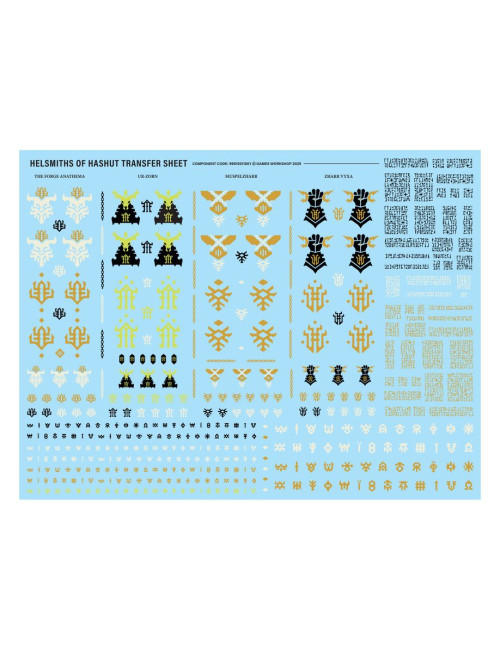 El kit trae una hoja con 450 calcomanías de gran calidad para los Herreros Infernales de Hashut, que incluyen símbolos para los zigurats de Ur-Zorn, Muspelzharr, Zharr Vyxa y la Forja Anatema, junto con otros sellos y runas malditas para decorar tus miniaturas.