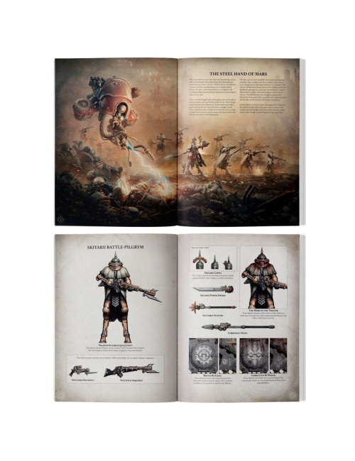– Skitarii Army List: Rules for using Skitarii Battle-Pilgrym Marshals, Skitarii Battle-Pilgrym Corpus, Bonepicker hosts, Skitarii Triaros Armoured Conveyor, Skitarii Karacnos Assault Tank, Skitarii Krios Battle Tank, and Skitarii Krios Venator Tank Destroyer in battles, including additional faction rules and new weapons to represent these fearsome warriors on the battlefield.