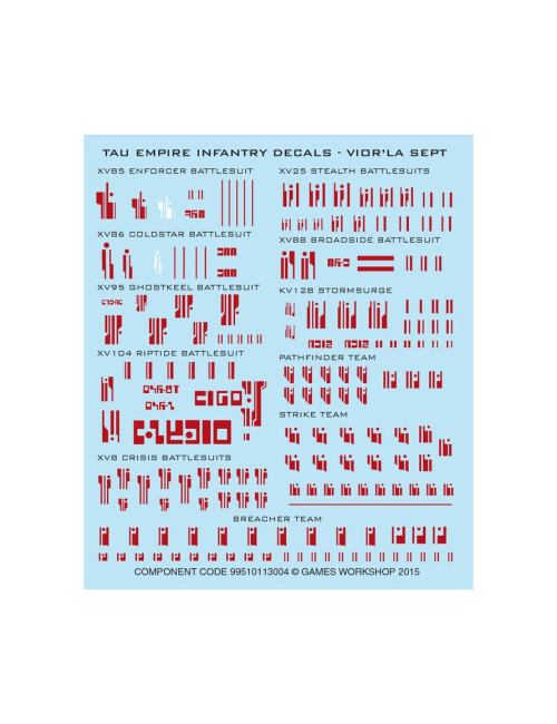 El kit incluye una hoja con 177 calcomanías de gran calidad para infantería del Imperio T’au: Sector Vior'la, con símbolos para Exoarmaduras Sigilo y otras unidades del Imperio T’au, como los Equipos de Rastreadores, las Exoarmaduras XV95 Fantasmal y otras.