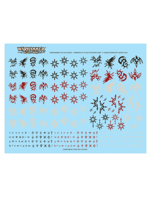 Además, el kit viene con 1 hoja con 246 calcomanías de gran calidad para Warriors of Chaos, con marcas para el Cult of the Bloodied Hound, Cult of the Slithering Serpent, Cult of the Carrion Crow y Cult of the Fell Raptor, junto con otros símbolos y runas del Caos.