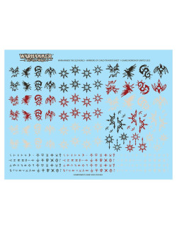 Además, el kit viene con 1 hoja con 246 calcomanías de gran calidad para Warriors of Chaos, con marcas para el Cult of the Bloodied Hound, Cult of the Slithering Serpent, Cult of the Carrion Crow y Cult of the Fell Raptor, junto con otros símbolos y runas del Caos.