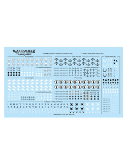 Además, la caja incluye 1 hoja con 618 calcomanías de gran calidad para infantería de las Legiones Astartes con símbolos de los Iron Warriors, Sons of Horus, Salamanders e Imperial Fists, además de números, marcas de honor, insignias genéricas, texto y emblemas de mando.