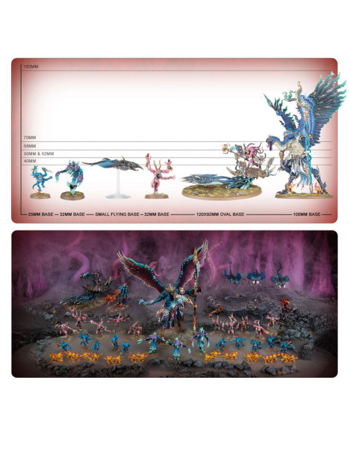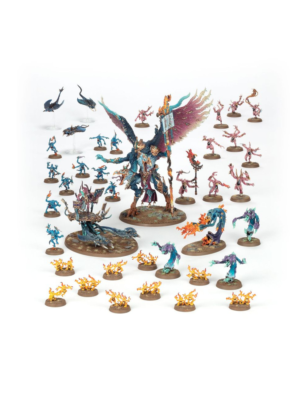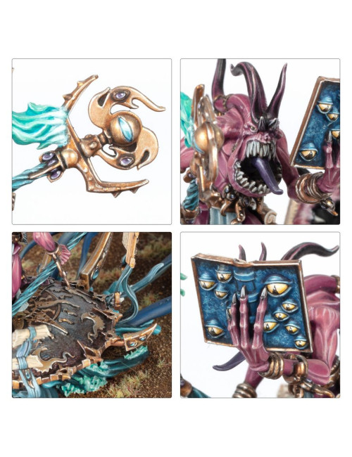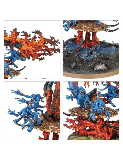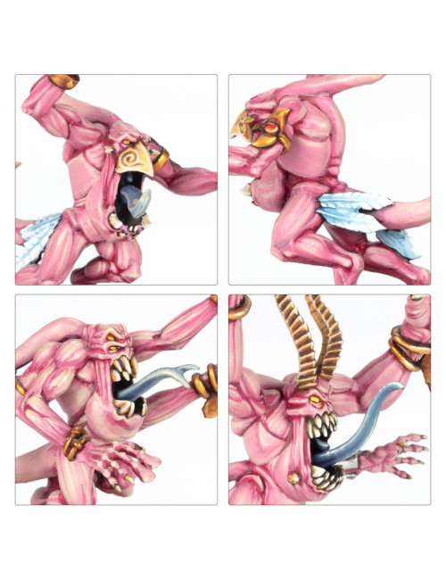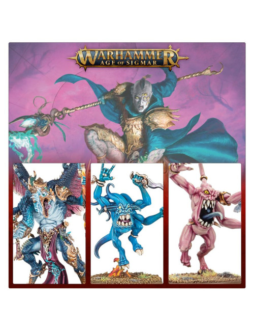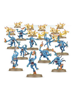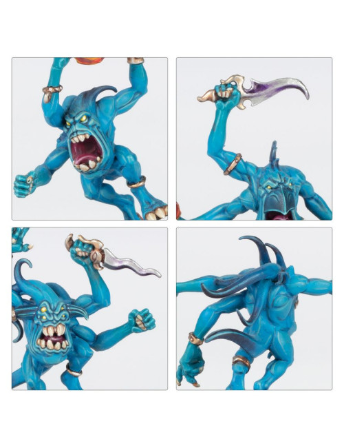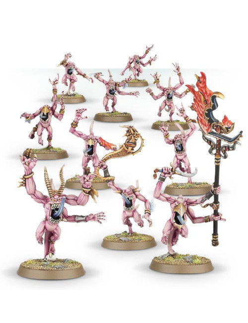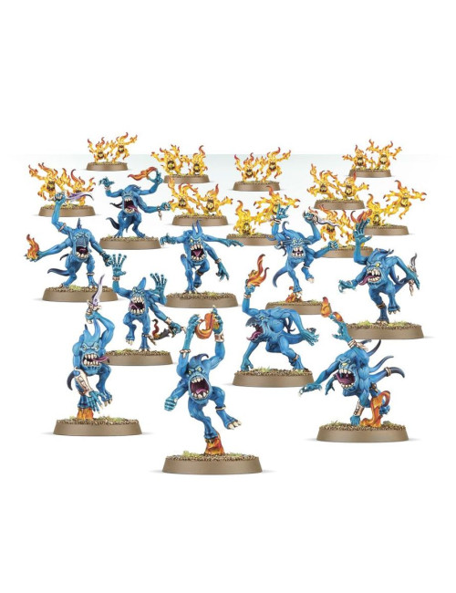Las fuerzas daemónicas de Tzeentch retuercen y transforman la realidad a su paso, rodeadas de oleadas de llamaradas arcanas que danzan mientras saltan y se contorsionan por el campo de batalla. Cuando uno de estos seres cae, otros brotan de su propia cuerpo, desbordando incluso a los enemigos más firmes y decididos.