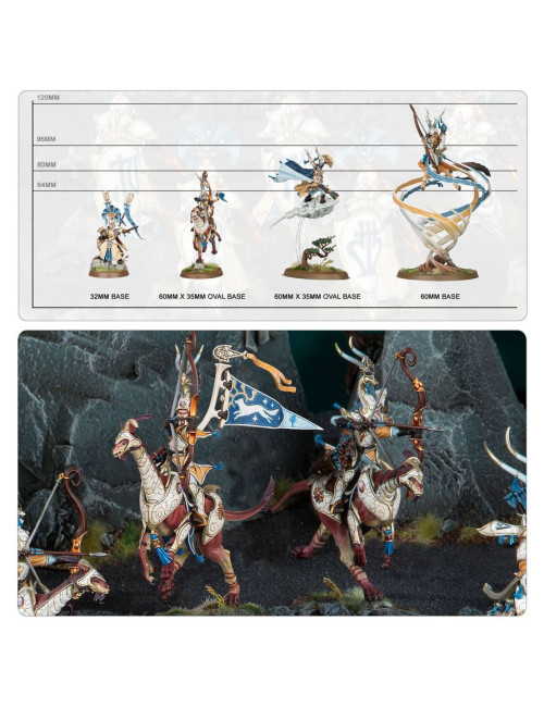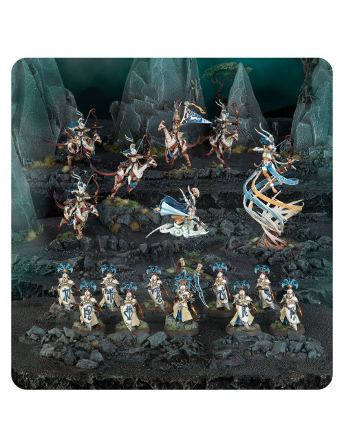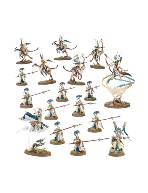 Alzada por el viento vigoroso, la Vanguardia Hurakan protege las fronteras del territorio Lumineth con la rapidez de un céfiro. Mediante su vínculo con el aire, estos devotos guerreros de Hysh luchan en el corazón de un huracán. Sus poderosas corrientes transportan a los aelfos y otorgan gran fuerza a sus flechas, mientras que los enemigos atrapados en el viento son superados, flanqueados y eliminados uno a uno.