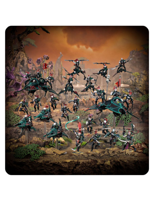 Esta completísima caja es ideal para empezar o ampliar una colección de Drukhari para Warhammer 40,000 de forma más económica que comprando los kits por separado. Liderada en teoría por una Súcubo que se lanza de cabeza al fragor del combate para cobrarse un sangriento tributo, se trata de una fuerza marcadamente agresiva. El grueso de la fuerza está formado por Brujas, infantería gladiadora impulsada por un ansia de sangre y un retorcida afición por la teatralidad. Los Infernales y Guadañas brindan velocidad y control del tablero, preparados para tomar objetivos lejanos, hostigar al enemigo y eliminar unidades debilitadas. Dos Ponzoñas aportan fuego de apoyo y proporcionan más velocidad a tu infantería. En conjunto, es un ejército veloz que golpea con fuerza donde y cuando quieras, ideal para representar un Destacamento Belleza y Muerte, cuyas reglas puedes encontrar en el Codex: Drukhari, disponible por separado.