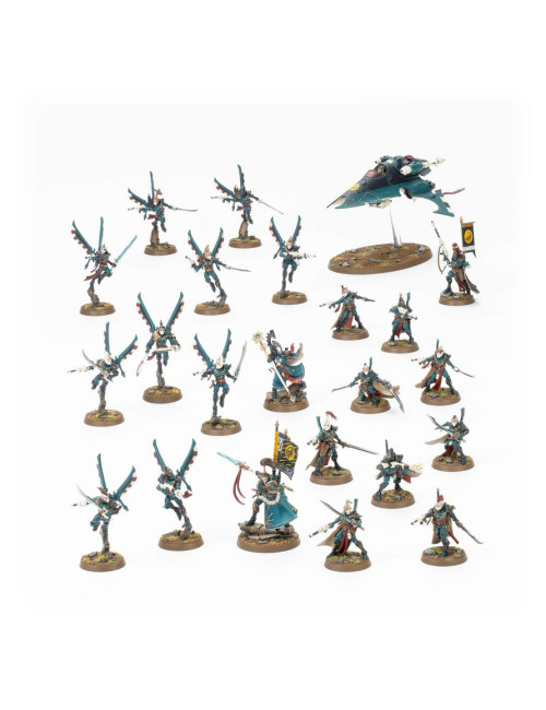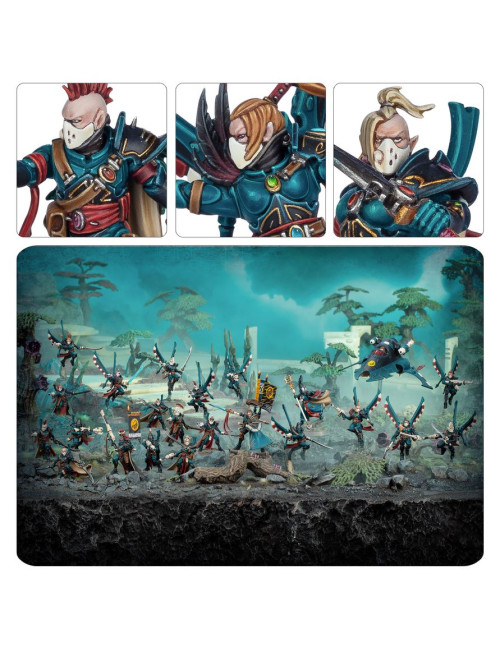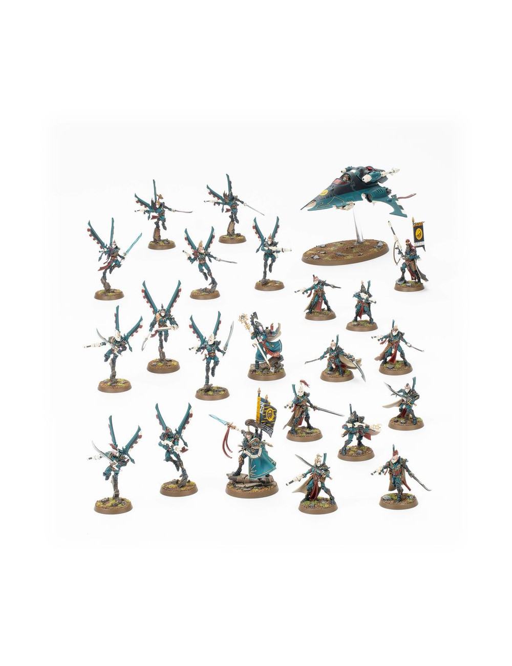 Esta completísima caja es ideal para empezar o ampliar una colección de Aeldari para Warhammer 40,000 de forma más económica que comprando los kits por separado. Juntos forman una fuerza rápida y potente, ideal para representar un Destacamento Incursores Ancestrales, cuyas reglas puedes encontrar en El Torbellino: El cubil del Tirano – Destacamentos, disponible por separado.
