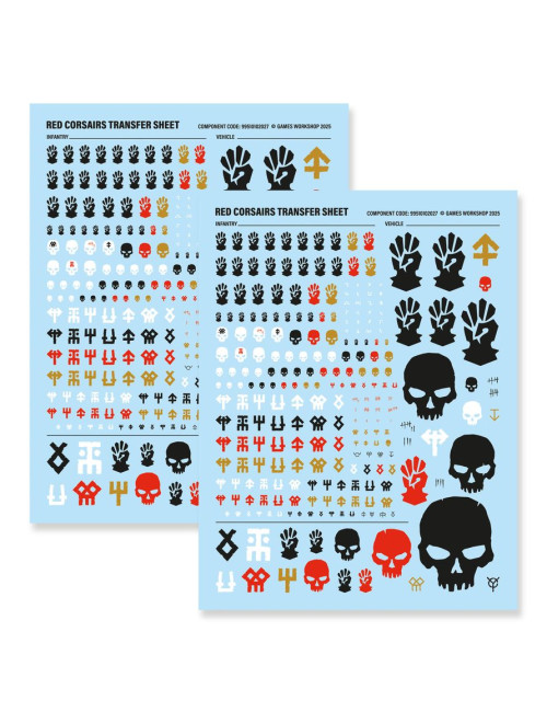 El kit también viene con dos hojas de calcomanías para Corsarios Rojos, cada una con 248 calcomanías de gran calidad para infantería y vehículos, con iconografía, calaveras, recuentos de víctimas y otros emblemas malditos.