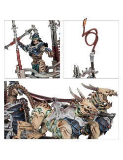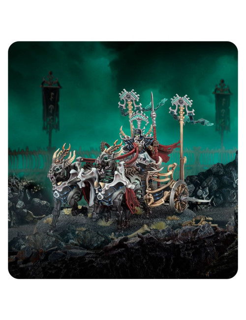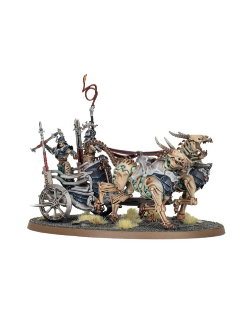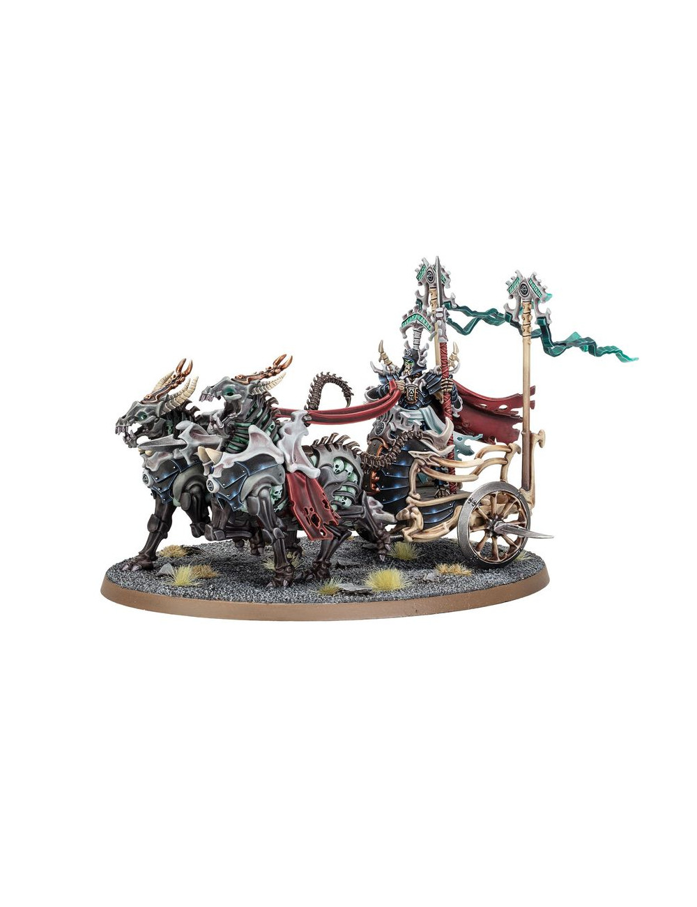 Con este kit multicomponente de plástico puedes montar un Soberano Kavalos en Carruaje, un líder veloz y poderoso para tus ejércitos de Osiarcas Cosechahuesos de Warhammer Age of Sigmar. Es capaz de mantener el ritmo de los elementos más veloces de tu ejército e inspirar a las unidades cercanas a la vez que suma su prodigiosa fuerza y destreza a las cargas de tu caballería y carruajes. Tal y como marca su rango, el Soberano Kavalos está ataviado con una exquisita armadura a medida y su carruaje está adornado con gemas y heráldica.