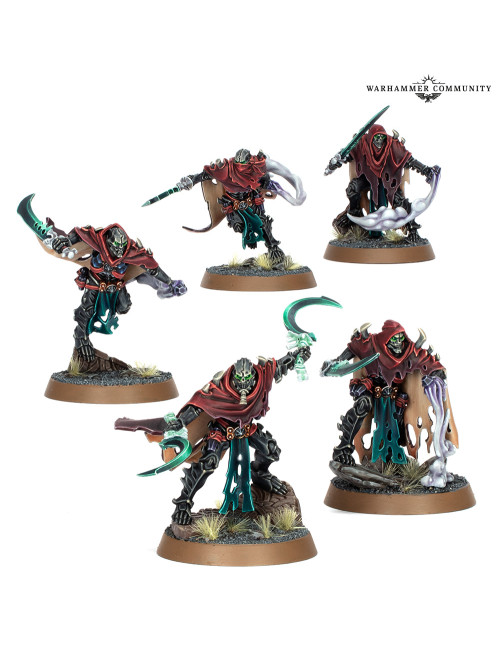 Con este kit multicomponente de plástico puedes montar cinco Cosechadores Mortis, mortíferos asesinos para tus ejércitos de Osiarcas Cosechahuesos de Warhammer Age of Sigmar. Ataviados con harapos, se lanzan a combatir contra los líderes enemigos y eliminarlos con sus letales filos de cosechador, para después arrojar sus necroalhajas, bombas de tumba-arena que funden la carne, y desaparecer de nuevo. Se incluyen piezas para montar un campeón opcional, y los demás Cosechadores pueden montarse con un segundo filo o una necroalhaja humeante. El kit también viene con 16 necroalhajas intercambiables que pueden añadirse a los cinturones de tus asesinos.