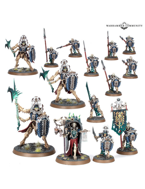 Con esta caja puedes montar a los Heraldos del Diezmo de Huesos, un Regimiento de renombre para tus ejércitos de Cortes Comecarne, Noctánimas y Necroseñores Pudrealmas de Warhammer Age of Sigmar. También puedes usar las unidades individuales en tu ejército de Osiarcas Cosechahuesos, y todo ello de forma más económica que comprando los kits por separado. La fuerza está liderada por Vokmortian, Señor del Diezmo de Huesos y la Guardia Immortis, escoltas de élite con enormes escudos y alabardas. El resto de la fuerza está formado por Guardias Mortek, leales tropas de línea excelentes para tomar y mantener objetivos. En conjunto forman un contingente duro y poderoso ideal para darle más potencia a tus ejércitos.