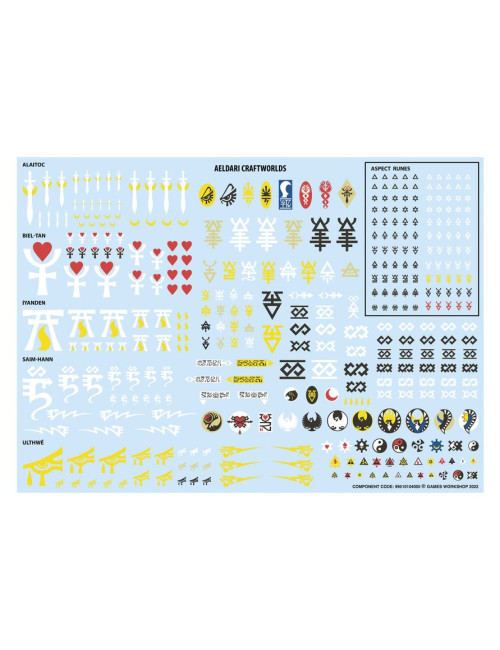 El kit viene con una hoja con 378 calcomanías de gran calidad para mundos astronave, con símbolos para los mundos astronave Alaitoc, Biel-Tan, Iyanden, Saim-Hann y Ulthwé, además de runas de senda y otros emblemas con los que decorar tus miniaturas.