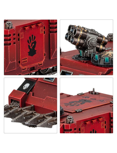 El Rhino del Caos viene con diversos elementos estéticos opcionales, como iconos del Caos, picas con trofeos, cadenas, garfios, pinchos de excavadora, placas de blindaje y un lanzaestragos. Su combibólter puede mejorarse a una combiarma, y se incluyen opciones para montar un artillero, un conductor o la escotilla cerrada.
