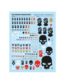 La caja también trae una hoja con 248 calcomanías de gran calidad para infantería y vehículos de los Corsarios Rojos, con iconografía, calaveras, recuentos de víctimas y otros emblemas malditos.