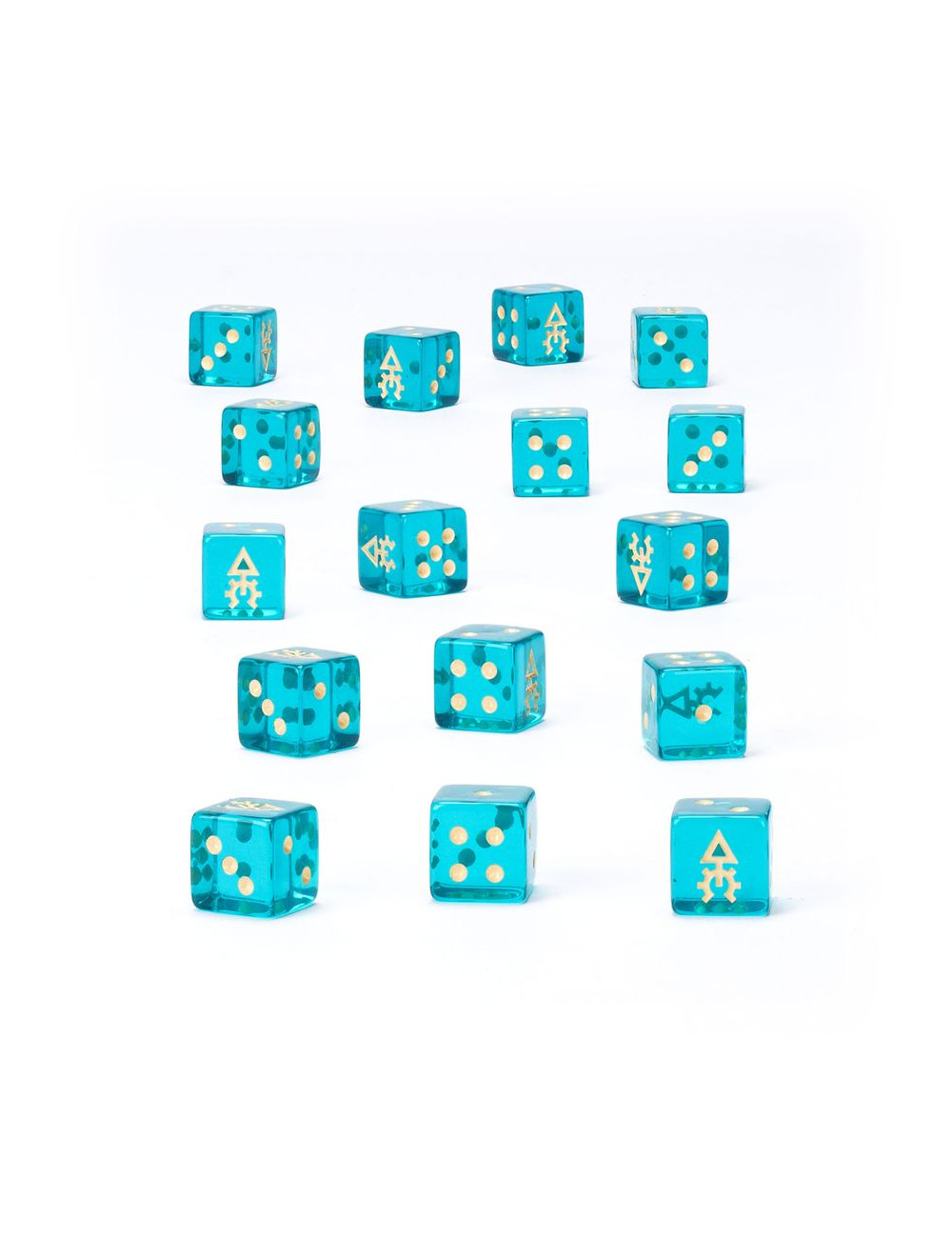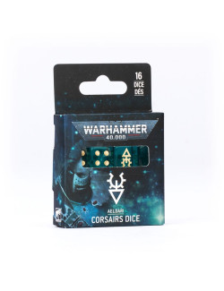 Un juego de 16 dados de seis caras con esquinas cuadradas para usar en partidas de Warhammer 40,000, con la temática de los Corsarios Aeldari. Están fabricados en plástico acrílico de color verde azulado con efecto gema y muescas en tinta color crema, y miden 16 mm de arista. Las caras del 1 al 5 presentan los tradicionales puntos y la cara del 6 está adornada con el icono pirata de los Corsarios Aeldari. Este juego de dados solo estará disponible hasta agotar existencias.