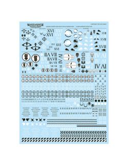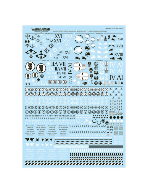 El kit viene con una hoja con 718 calcomanías de gran calidad para vehículos superpesados de las Legiones Astartes, con iconos de los Imperial Fists, Sons of Horus, Salamanders y Iron Warriors, además de números y otras marcas para decorar tu tanque.