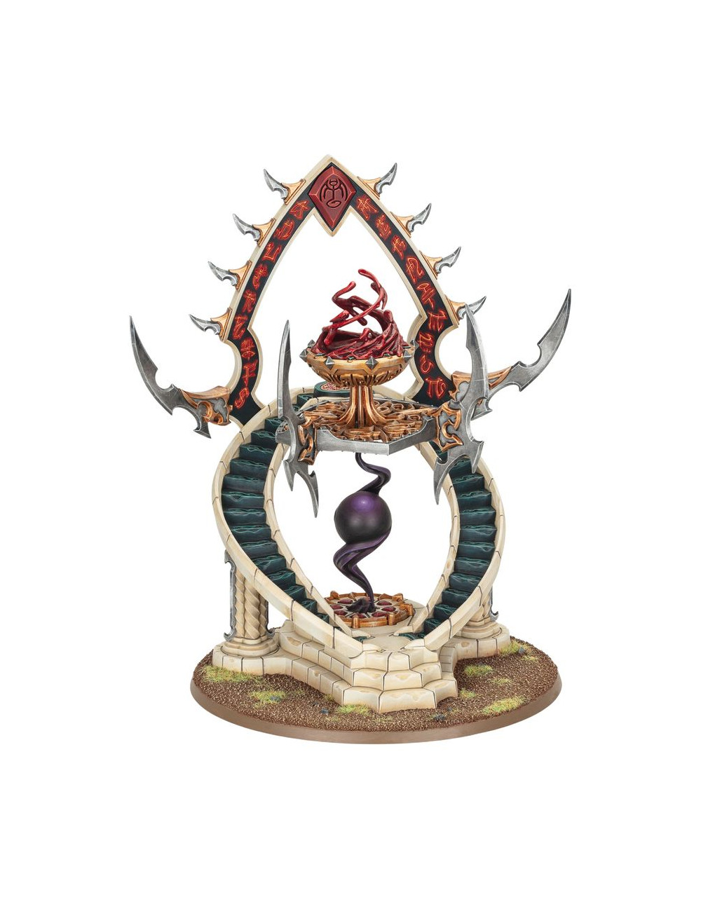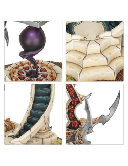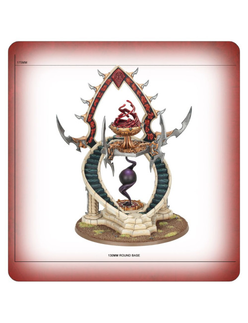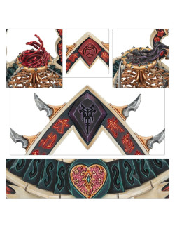 Con este kit multicomponente de plástico puedes montar un Santuario de Tributos Oscuros, una pieza de terreno de facción para tus ejércitos de Hijas de Khaine de Warhammer Age of Sigmar. Invoca las oscuras bendiciones de Khaine en el fragor de la batalla y convierte tu ejército en una fuerza todavía más homicida. Esta estructura, repleta de crueles filos, muestra un remolino de sangre sobre una bola de energía misteriosa que la convierte en un estupendo proyecto de pintura y una pieza central ideal para tu colección. Puedes elegir entre un icono de Morathi-Khaine o uno de Morai-Heg para la parte superior de la estructura, y la sangre en la jofaina del altar puede reemplazarse por un rastro de humo.