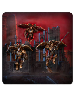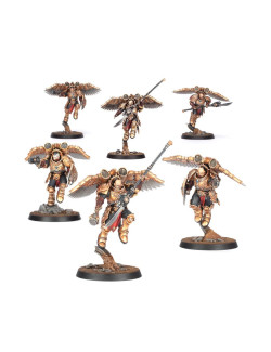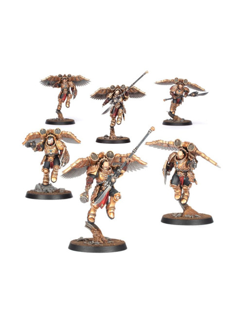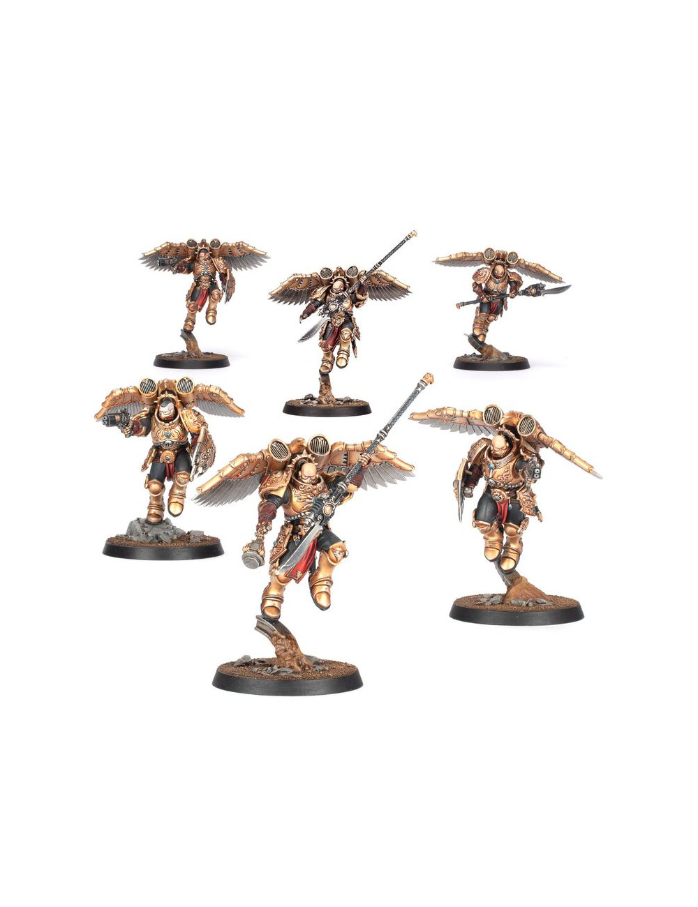Cada miembro de la unidad puede equiparse con un tarsus buckler y un brutal kinetic destroyer para abatir desde lejos a los enemigos del Emperador, o con una verutum lance para acabar con ellos en combate cuerpo a cuerpo. Cada uno puede equiparse con una neutronium cascade mine para destruir molecularmente los vehículos enemigos, y dos pueden montarse con estos siniestros dispositivos en la mano. También se incluyen varias piezas intercambiables para que personalizar a tus depredadores alados sea de lo más sencillo.
