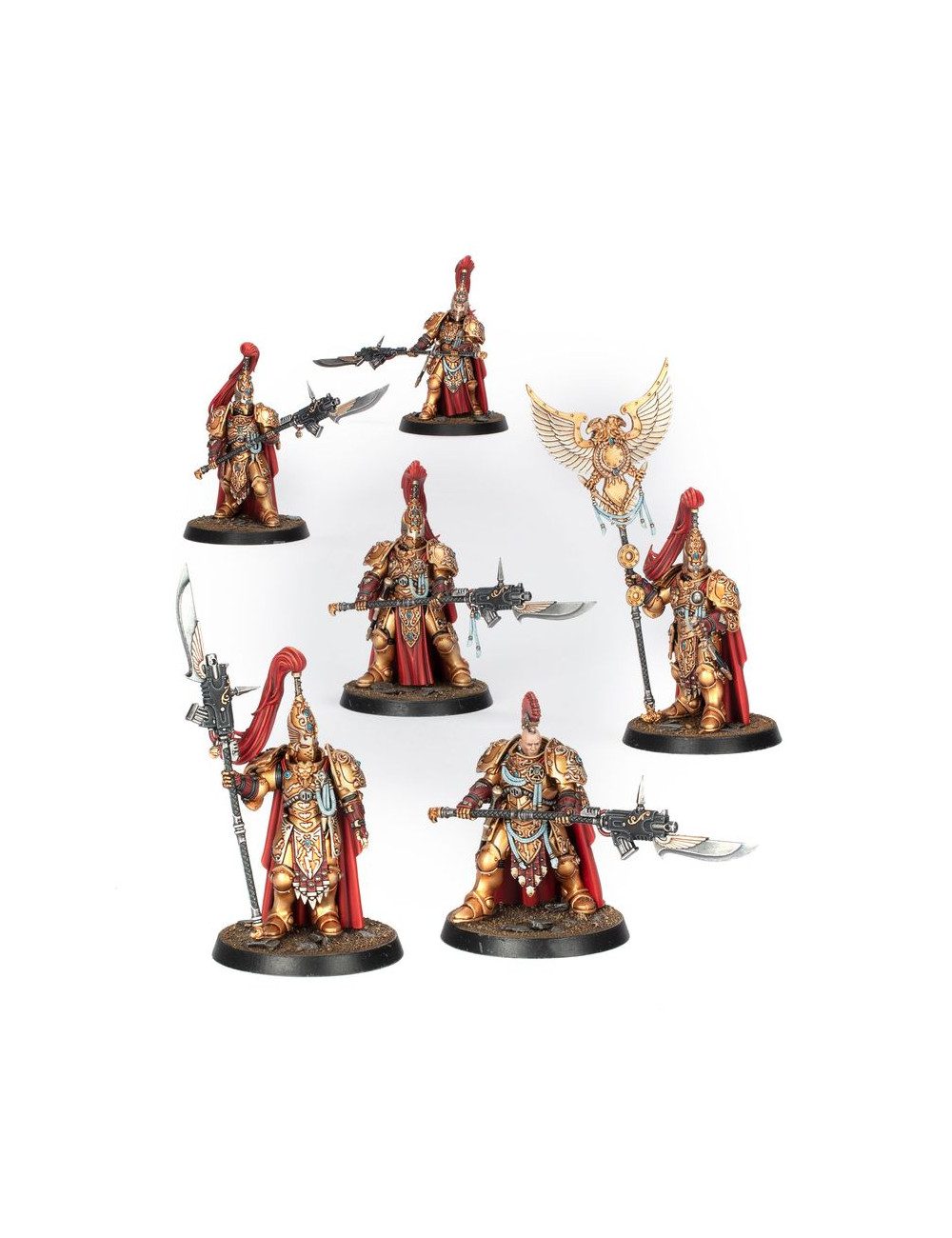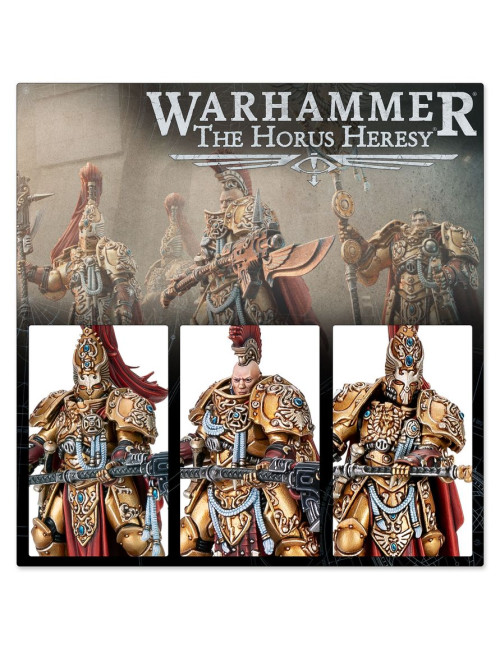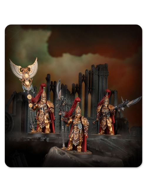 Los Guardias Custodios son guerreros de un poder aterrador, más fuertes, rápidos y resistentes incluso que los Marines Espaciales. Ataviados con armaduras de una aleación única y armados con letales lanzas de guardián, son símbolos vivientes de la autoridad del Emperador y combatientes sin parangón.