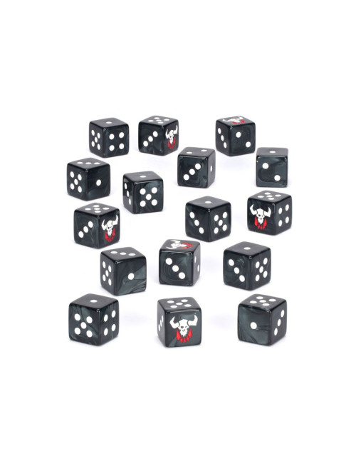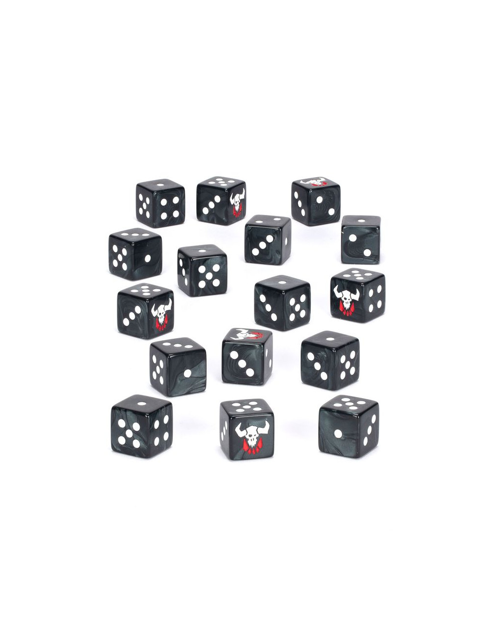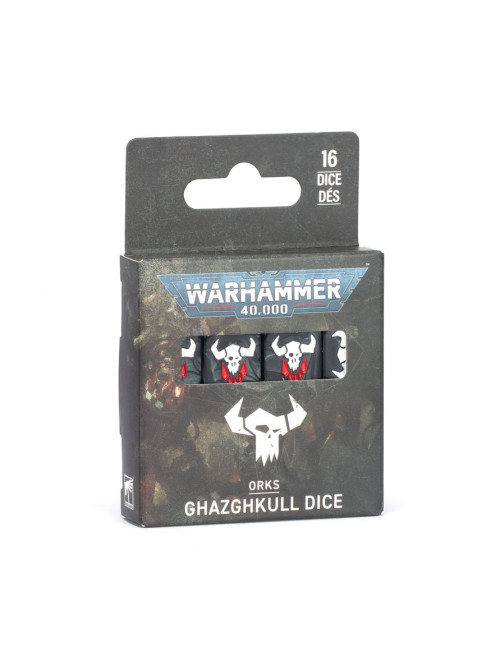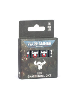 Este es un juego de 16 dados de seis caras con esquinas cuadradas para usar en partidas de Warhammer 40,000, con la temática de Ghazghkull Thraka. Están fabricados en plástico acrílico de color negro perlado con muescas en tinta de color blanco y rojo metálico y miden 16 mm de arista. Las caras del 1 al 5 presentan los tradicionales puntos y la cara del 6 está adornada con el brutal (pero aztuto) emblema de Ghazghkull Thraka. Este juego de dados solo estará disponible hasta agotar existencias.