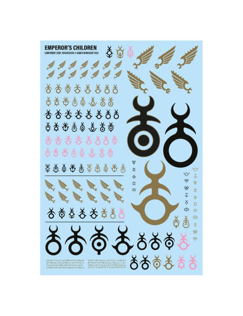 El kit incluye una hoja con 150 calcomanías de gran calidad para Hijos del Emperador para que decores con ellas tus miniaturas, con símbolos de los Hijos del Emperador de diversos colores y tamaños, así como una selección de runas y escrituras retorcidas de Slaanesh.
