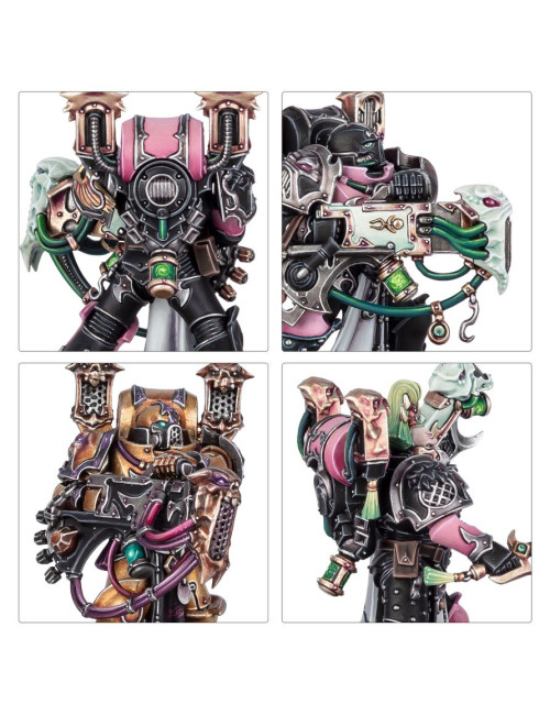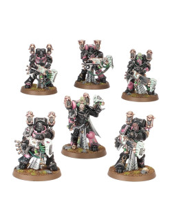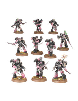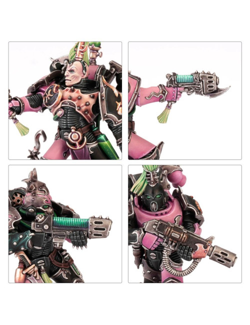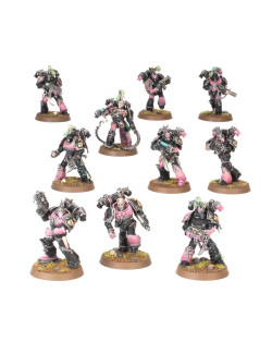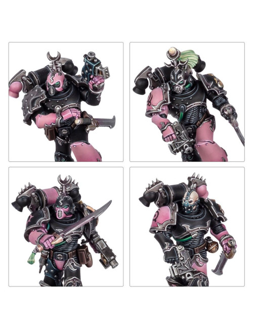 Los Infractores y Torturadores usan las mismas piezas, por lo que puedes montar 20 Infractores, 20 Torturadores o 10 de cada. Los Torturadores están armados con un bólter y un arma cuerpo a cuerpo, y dos de cada 10 pueden armarse con un arma especial: la caja incluye cuatro rifles de fusión y cuatro rifles de plasma. Las miniaturas también pueden montarse como Infractores, guerreros expertos en el combate cuerpo a cuerpo armados con una pistola bólter y un sable de duelista. Además, el kit incluye Obsesos para liderar las escuadras, y a la hora de montarlos puedes elegir entre dos tejidos distintos y equiparlos con pistola de plasma o pistola bólter en una mano y látigo de éxtasis o espada de energía en la otra. Elijas lo que elijas, encontrarás un montón de opciones para personalizar tus escuadras, como cabezas y hombreras intercambiables. El kit contiene 24 cabezas con casco, 16 descubiertas, 24 hombreras de los Hijos del Emperador y 40 normales. También incluye un montón de accesorios como granadas, bolsas y estimulantes de combate.